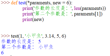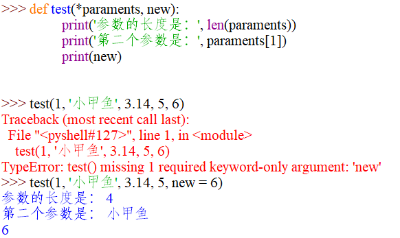 需要注意的是:如果收集參數後邊還需要加上其它定制的參數,那麼在調用函數的時候應該使用關鍵字參數,否則Python就會把你後面的參數全部列為收集參數的範疇了。