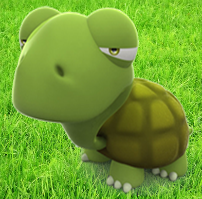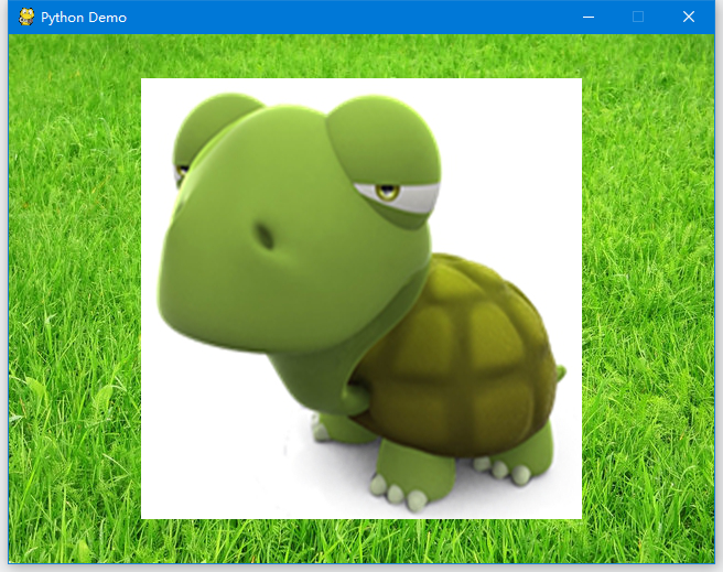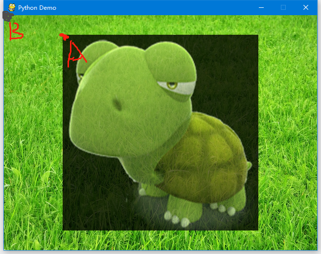 然後我們將整個temp 區域設為透明度200,其實現在的整個temp 區域(Surface 對象)就是A區域大小,然後背景是該區域的草地,主角是小烏龜的一幅圖片。如圖所示:(這個就是目前的temp了)